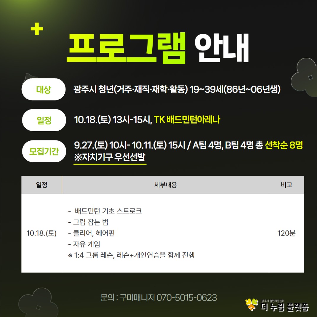 - 내용 25년 10월 청년참여 프로그램 <스매시 타임! 배드민턴 클래스> 교육