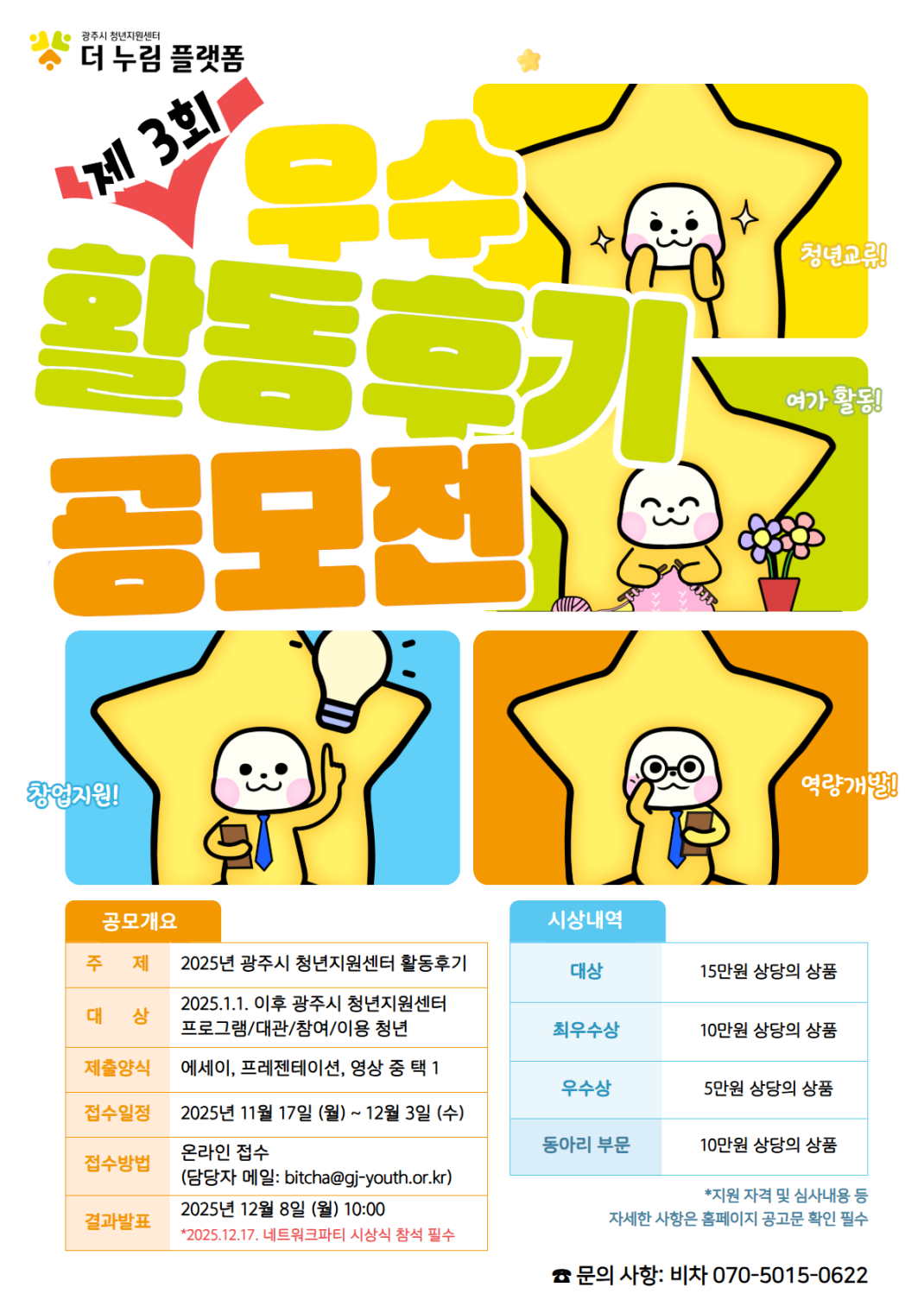 - 수상자에 한하여, ‘2025년 광주시 청년지원센터 네트워킹 파티’ 시상식 참석 및 수상작품 발표를 요청 할 수 있습니다.