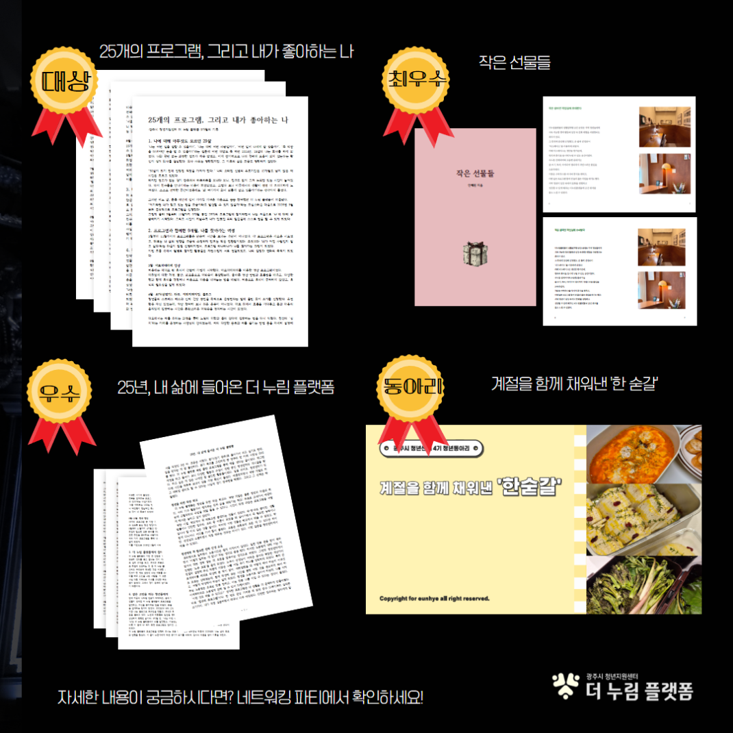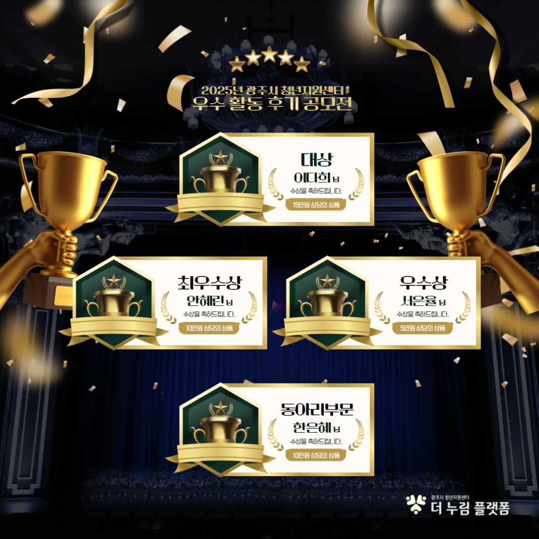 2025년 광주시 청년지원센터 우수 활동 후기 공모전 수상자 발표! 작성자관리자 등록일 25-12-08 조회53회 본문 2025년 광주시 청년지원센터 우수 활동 후기 공모전수상자 발표!올해는 더- 많은 청년분들께서 참여해주셨는데요,눈물이 핑- 코가 찡- 감동적이고 정성스러운 후기가 참 많았습니다:)그 많은 후기 중에서 어렵게 선발한!영광의 수상자를 공개합니다수상자 분들의 자세한 후기 내용은"네트워킹 파티 시상식" 에서! 확인하실 수 있습니다. 경기청년 역량강화 기회지원 사업 신청 기간 연장! 목록