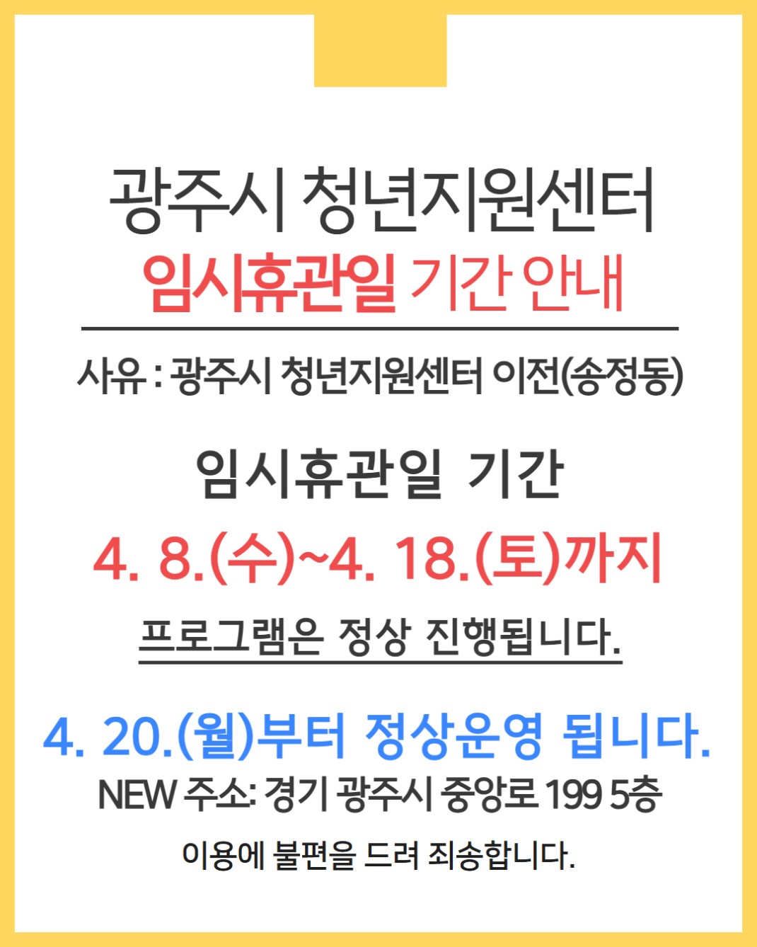 광주시 청년지원센터 임시휴관일 기간 안내 작성자최고관리자 등록일 26-04-02 조회23회 본문 안녕하세요. 광주시 청년지원센터입니다.광주시 청년지원센터가 송정동으로 이전함에 따라 임시휴관을 시행합니다.이용에 참고 부탁드립니다.※ 임시휴관일 기간4. 8.(수)~4. 18.(토)까지*프로그램은 정상 진행됩니다.※ 4. 20.(월)부터 정상운영 됩니다.*NEW주소: 경기 광주시 중앙로 199 5층 2026년 청년 1인 가구 이사 지원 사업(독립응원 패키지) 4월 신청자 모집 목록