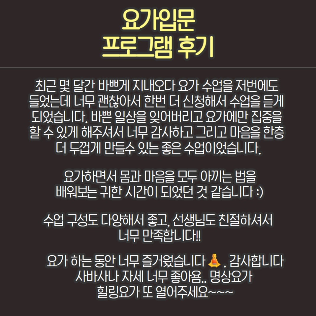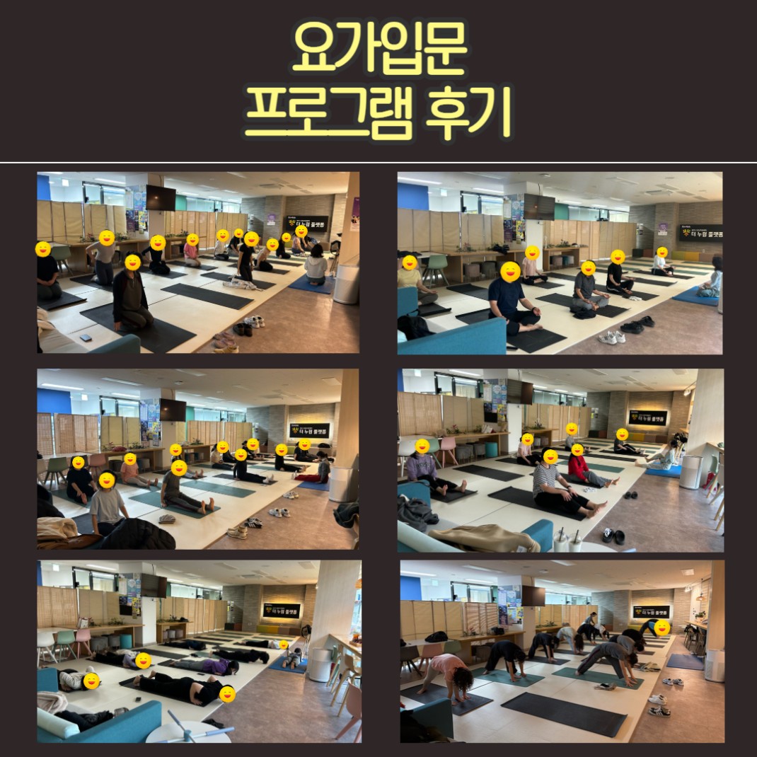 <요가입문 프로그램 후기>10~11월 오운완 작성자관리자 등록일 25-11-13 조회5회 본문 안녕하세요! 여가개선 사업 담당 늘찬매니저입니다.10~11월, 2개월동안 진행된 <요가입문반> 프로그램이 마무리 되었습니다.8회차의 긴 수업동안 열심히 참여해주신 참가자분들의 후기와 현장 사진 함께 보시죠!기타문의 늘찬매니저 070-5015-0639 창업누림 11월 스트레스 관리 및 관계형성 방법 교육 후기 2025년 11월 취업직무 <소자본으로 하는 실크플라워 창업> 프로그램 후기 목록