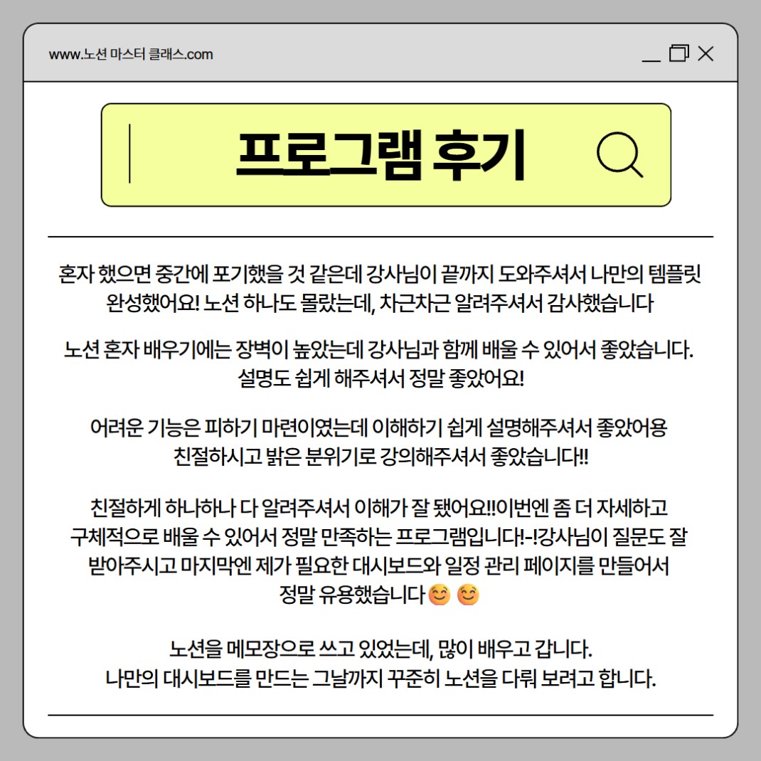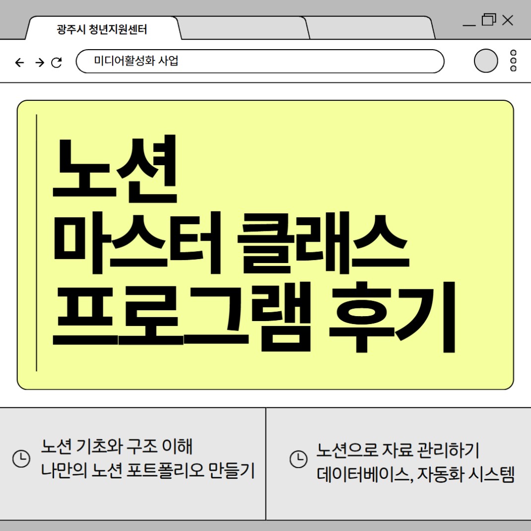 <노션 마스터 클래스 프로그램 후기> 9월 미디어활성화 작성자관리자 등록일 25-09-30 조회30회 본문 안녕하세요! 미디어활성화 담당 늘찬매니저입니다.9월에는 7회차의 <노션 마스터 클래스> 프로그램을 운영했습니다.프로그램에 참여해주신 참가자분들의 후기와 현장 사진, 함께 보시죠!기타문의 늘찬매니저 070-5015-0639 2025년 9월 4차산업 <AI영상제작> 프로그램 후기 2025년 8~9월 취업직무 <주식입문> 프로그램 후기 목록