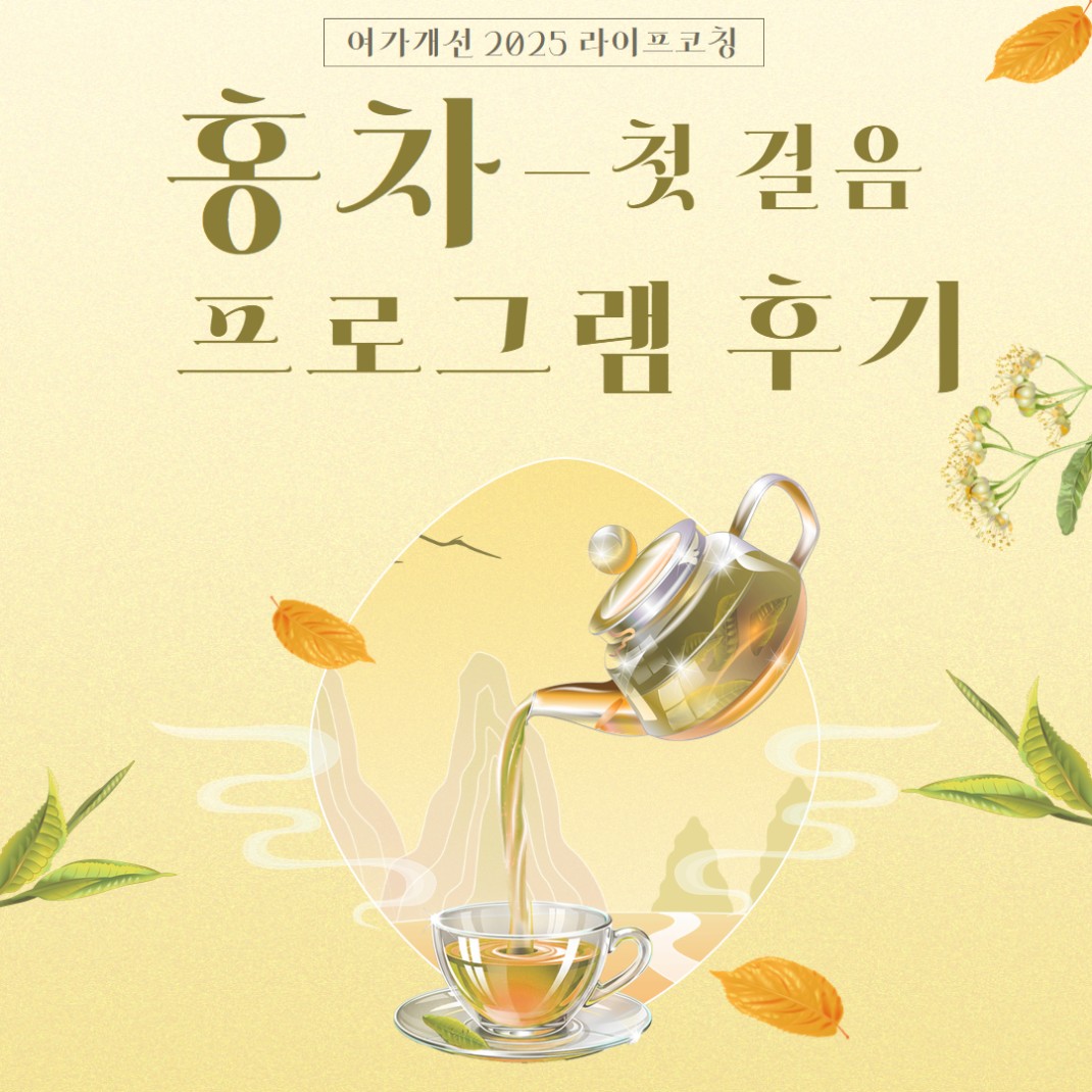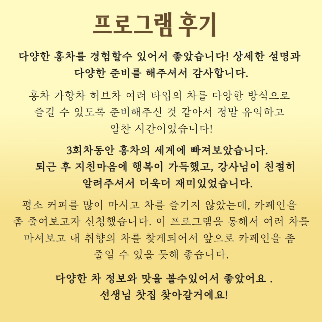 <홍차, 첫 걸음 후기> 11월 라이프코칭 작성자관리자 등록일 25-11-26 조회19회 본문 안녕하세요! 여가개선 사업 담당 늘찬매니저입니다.2025년 마지막 여가 프로그램인 <홍차, 첫 걸음> 프로그램이 마무리 되었습니다.3회차의 시간동안 다양한 홍차를 만나면서 나만의 블렌딩 홍차와 밀크티도 만들어볼 수 있는 시간이었어요.참가자 분들의 후기와 사진, 함께 보시죠!기타문의 늘찬매니저 070-5015-0639 <독서모임:질문하는 나, 생각하는 나 프로그램 후기> 8~11월 라이프코칭 <6주만에 나만의 책 만들기 후기> 10~11월 미디어 활성화 목록
