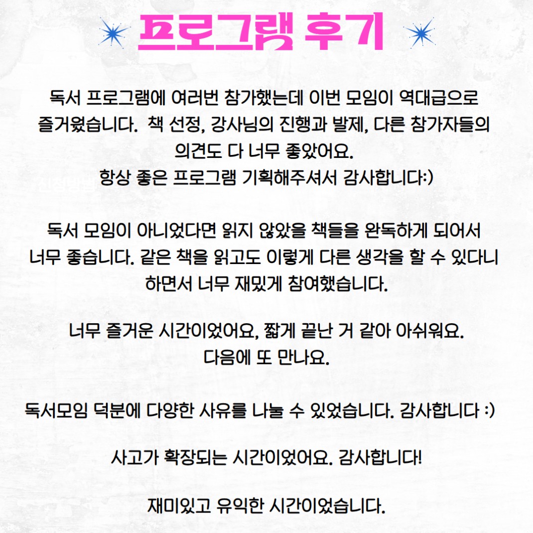 긴 시간동안 다양한 분야의 책을 함께 읽고 이야기 나누어보면서 나만의 생각, 나만의 질문법을 찾아보는 시간이었습니다.