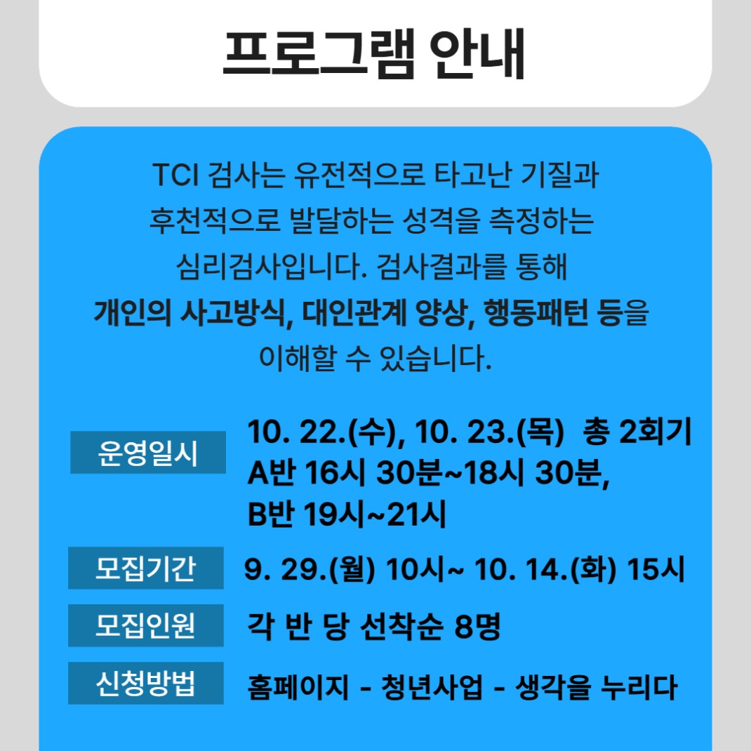 올 해의 마지막 심리지원 프로그램으로 <TCI검사를 활용한 진로탐색> 프로그램을 진행합니다.