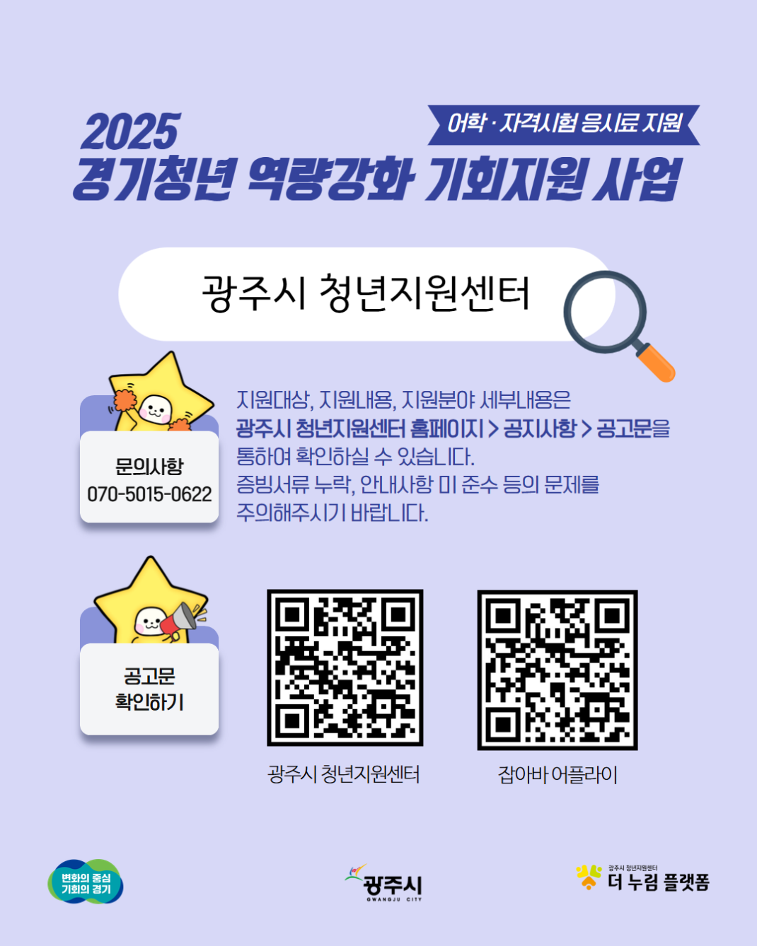 - 지원내용: 어학시험, 자격시험 응시료 지원 / 청년 1명당 최대 30만원 범위 내 실비 지원