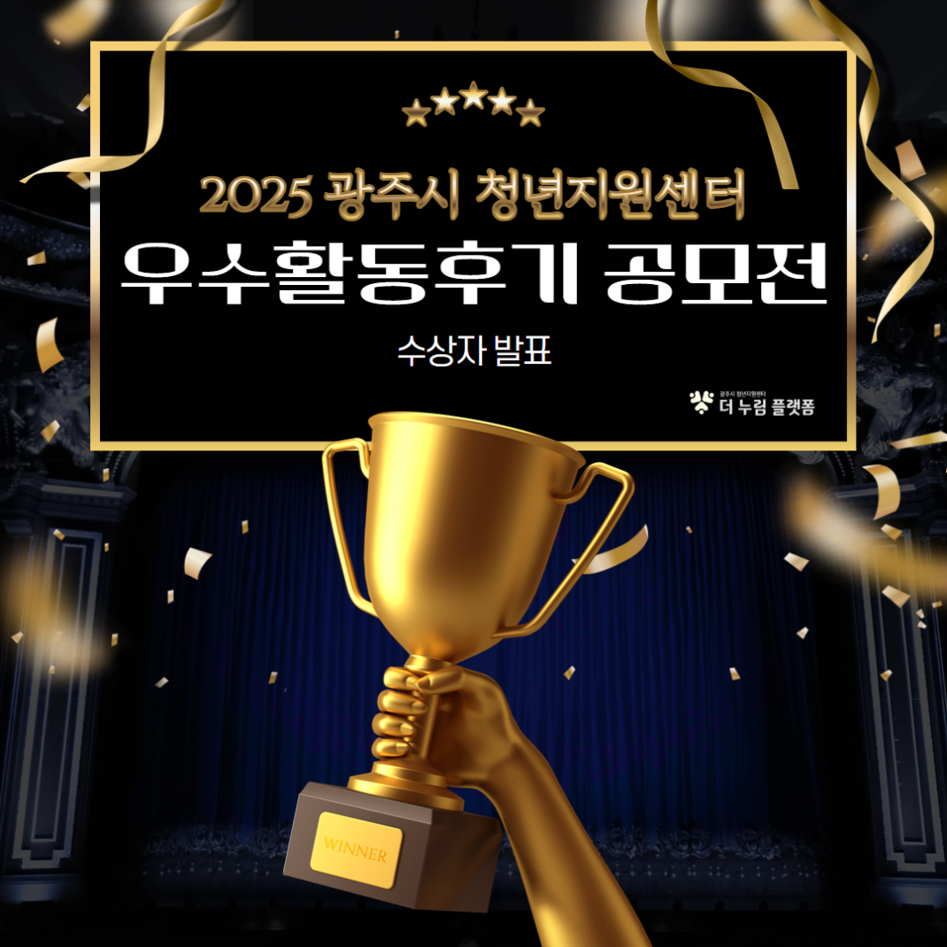 2025년 광주시 청년지원센터 우수 활동 후기 공모전 수상자 발표! 작성자관리자 등록일 25-12-08 조회13회 본문 2025년 광주시 청년지원센터 우수 활동 후기 공모전수상자 발표!올해는 더- 많은 청년분들께서 참여해주셨는데요,눈물이 핑- 코가 찡- 감동적이고 정성스러운 후기가 참 많았습니다:)그 많은 후기 중에서 어렵게 선발한!영광의 수상자를 공개합니다수상자 분들의 자세한 후기 내용은"네트워킹 파티 시상식" 에서! 확인하실 수 있습니다. 경기청년 역량강화 기회지원 사업 신청 기간 연장! 목록