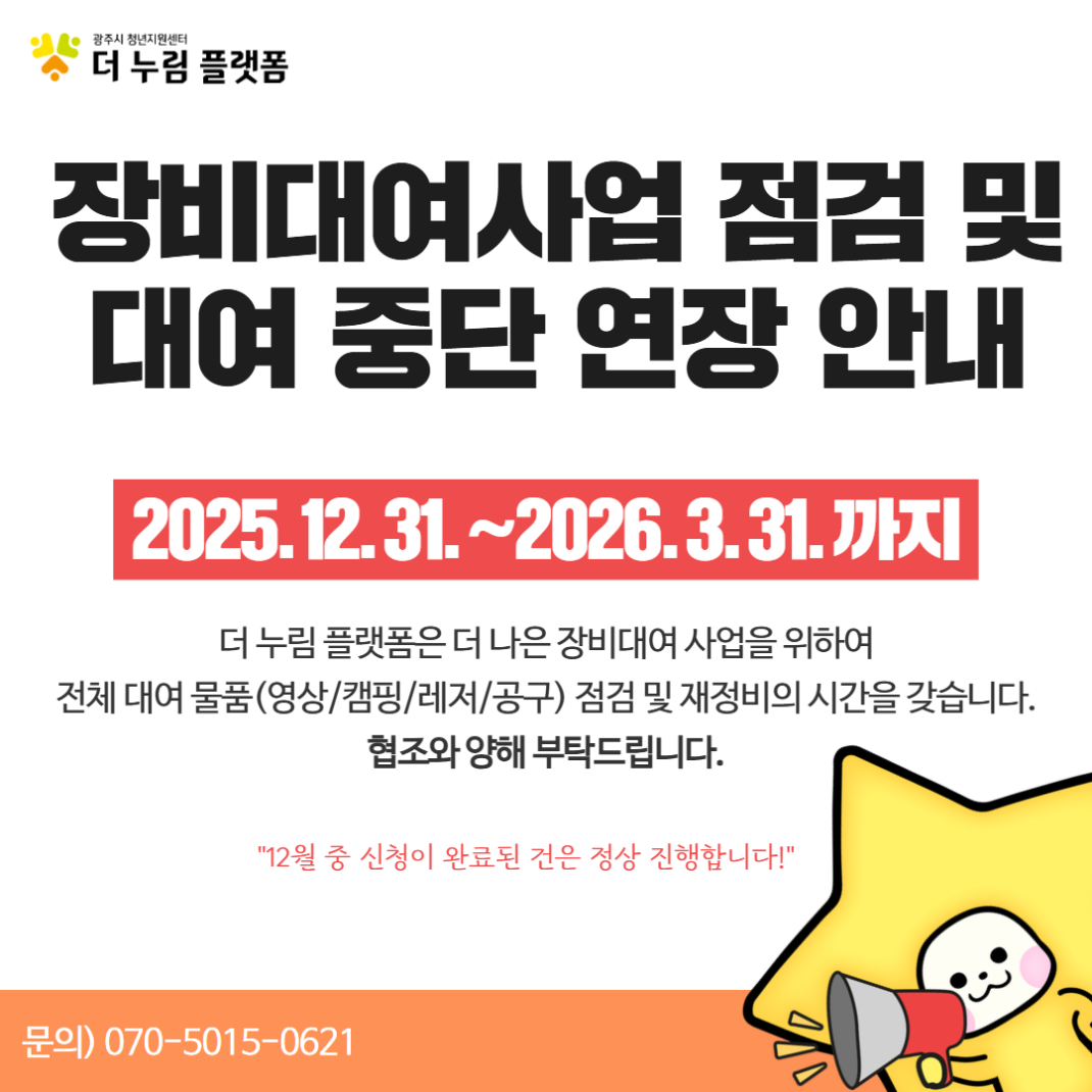 장비대여사업 점검 및 대여 중단 연장 안내 작성자관리자 등록일 26-02-04 조회15회 본문 대여사업 점검 및 대여 중단 안내더 누림 플랫폼은 더 나은 장비대여 사업을 위하여 전체 대여물품 점검 및 재정비의 시간을 갖습니다.협조와 양해 부탁드립니다.☎ 070-5015-0621 2026년 제1차 광주시 청년지원센터 직원 채용 1차(서류전형) 합격자 공고 목록