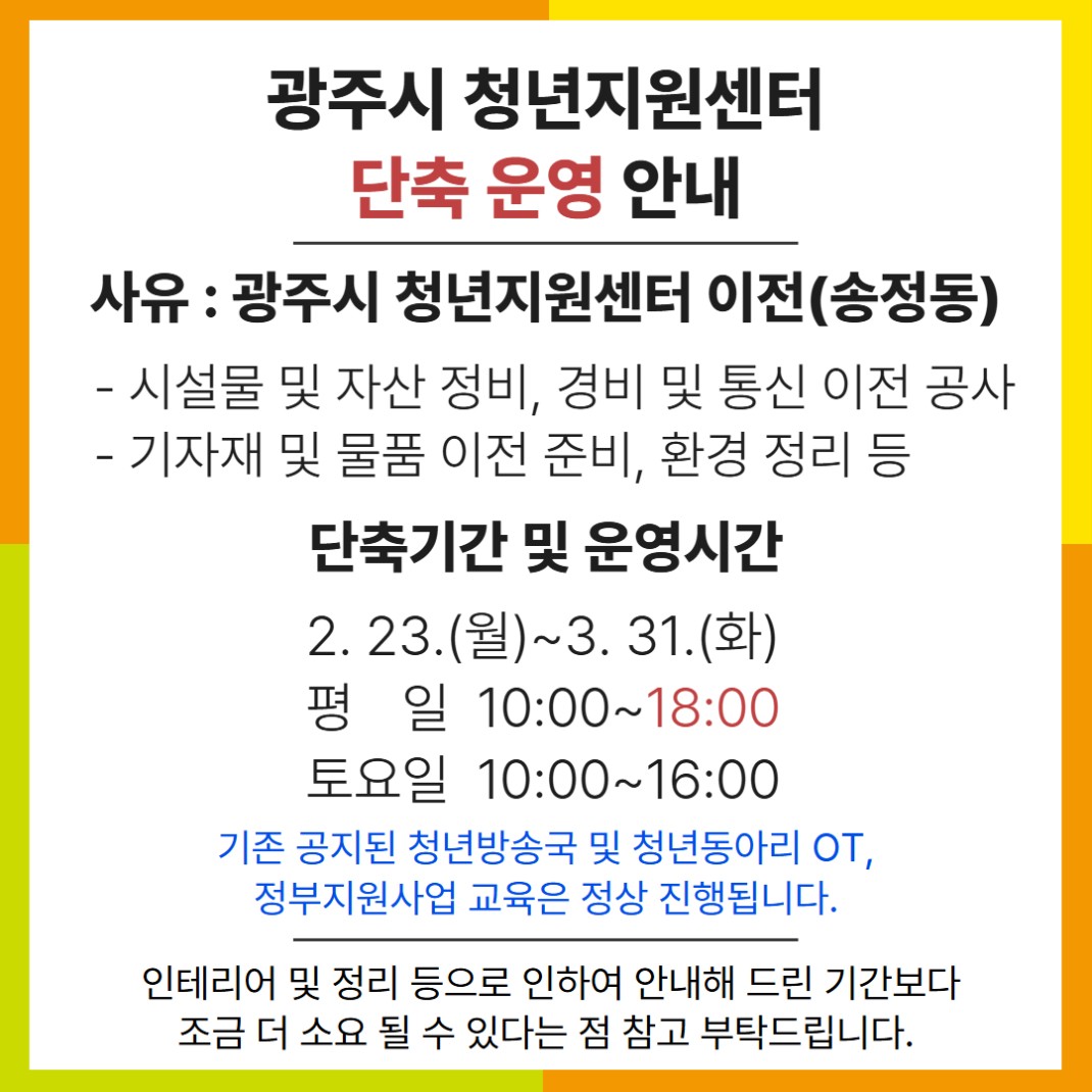 광주시 청년지원센터가 송정동으로 이전함에따라 시설물과 자산 정비, 기자재 및 물품 이전 준비를 위하여 단축 운영을 시행합니다.