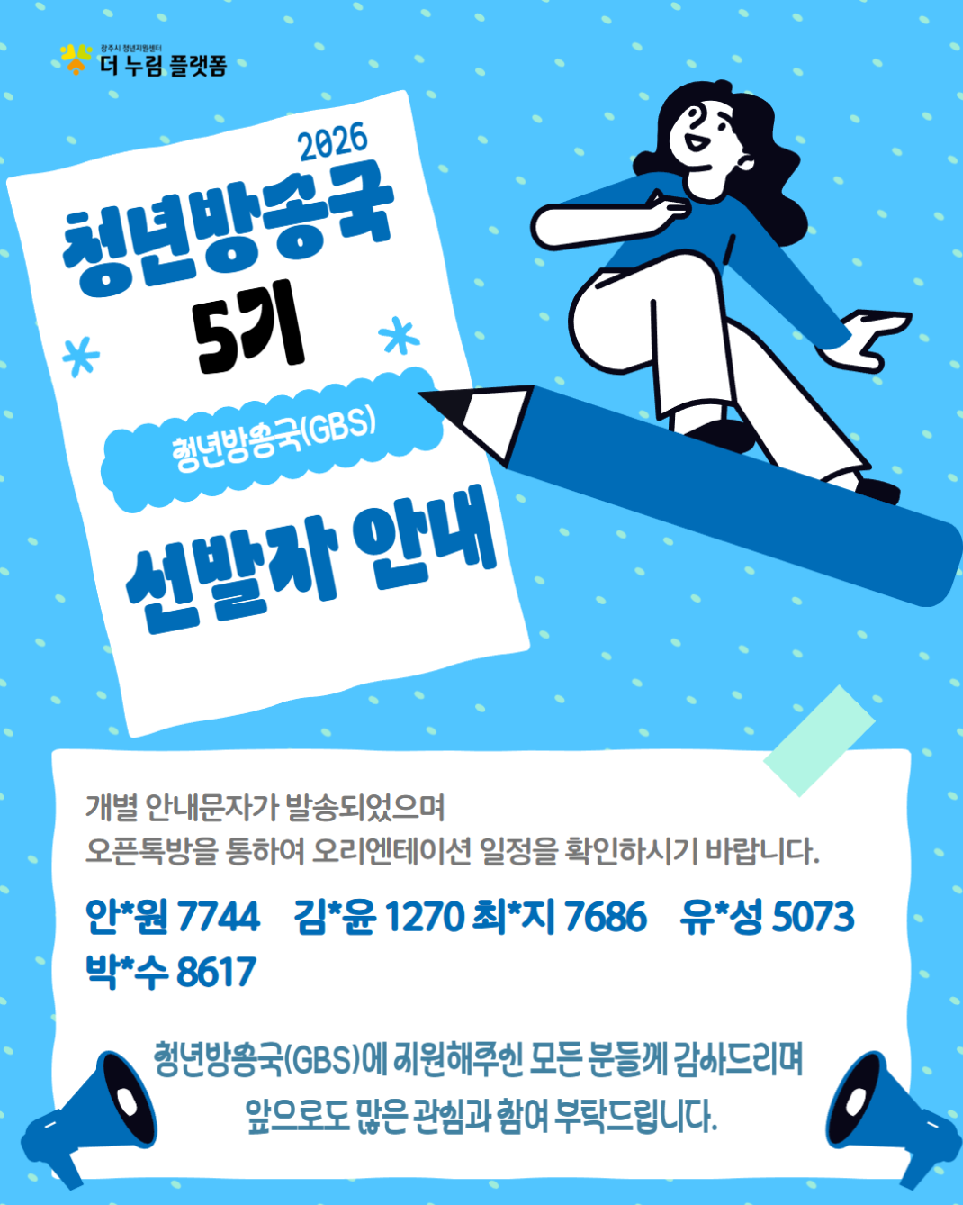 2026년 청년방송국(GBS) 5기 선발자 안내 작성자관리자 등록일 26-02-19 조회20회 본문 청년방송국(GBS) 5기에 지원하신 모든 분들께 감사드리며,앞으로도 많은 관심과 참여 부탁드립니다. 광주시 청년지원센터 단축 운영 안내 목록