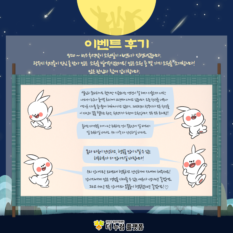 9월 문화 팩토리 추석맞이 소원빌기 이벤트 당첨자 발표 작성자관리자 등록일 23-10-04 조회787회 본문 9월 문화 팩토리 문화지원추석맞이 소원빌기 이벤트 당첨자 발표많은 관심과 참여해주셔서 감사합니다! 10월 수 제작소 취미개발지원 우드트레이 수령자 발표 10월 프로그램 일정 목록