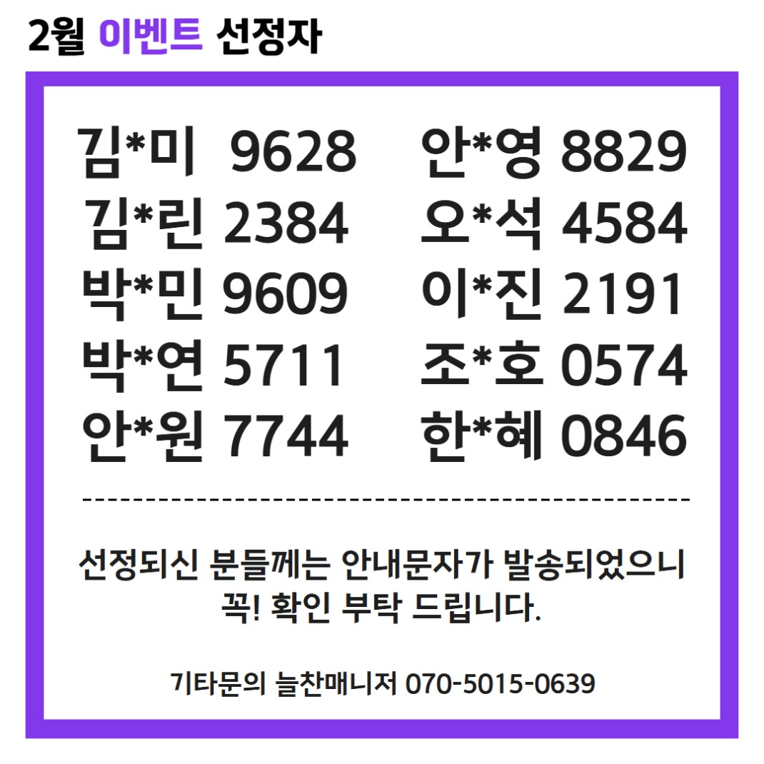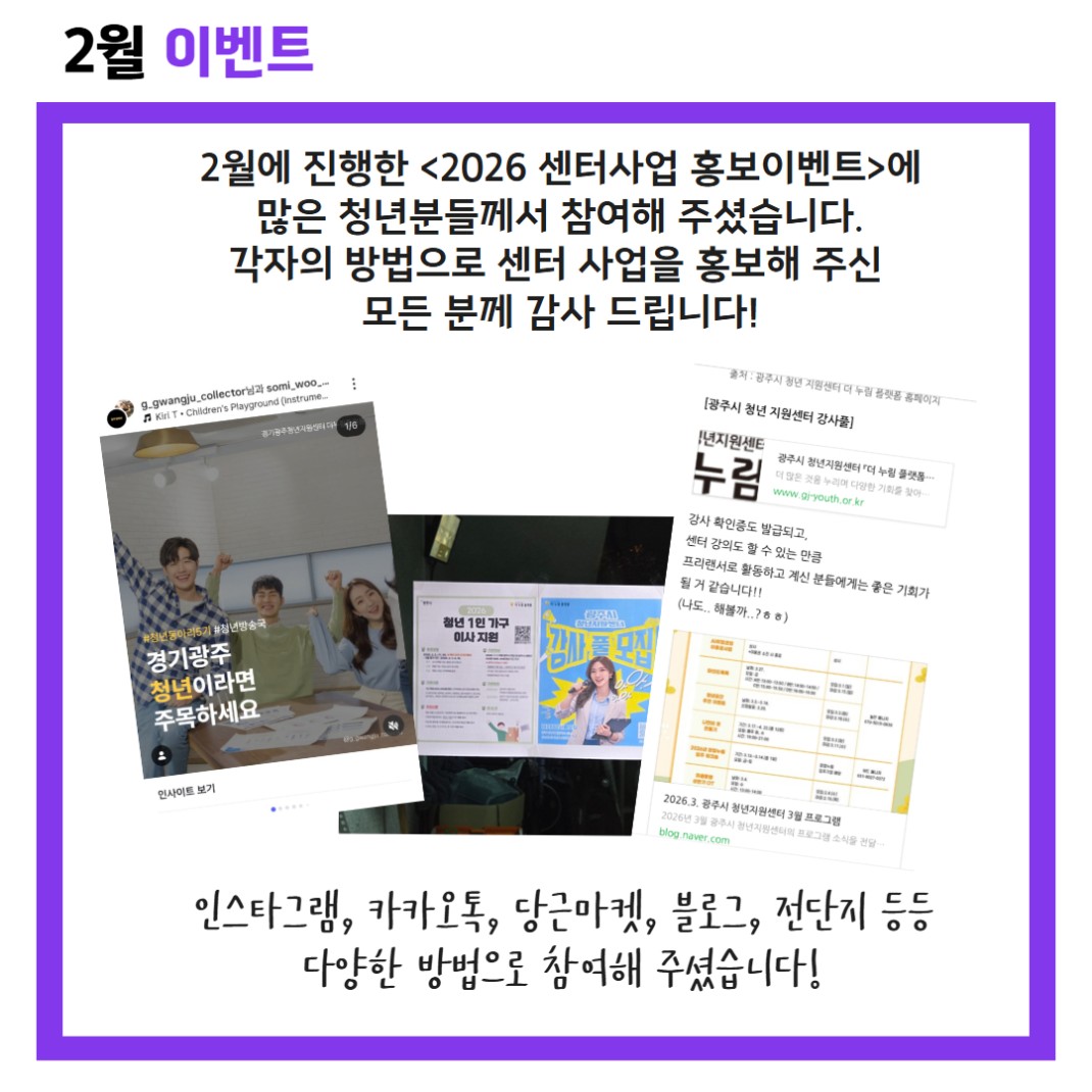 <2026 센터사업 홍보이벤트 선정자 발표> 2월 이벤트 작성자관리자 등록일 26-03-06 조회88회 본문 2월에 진행한 <2026 센터사업 홍보이벤트>에많은 청년분들께서 참여해 주셨습니다.각자의 방법으로 센터 사업을 홍보해 주신 모든 분께 감사 드립니다!기타문의 늘찬 070-5015-0639 2026년 마음동행 상반기(1기) 오리엔테이션 후기 목록