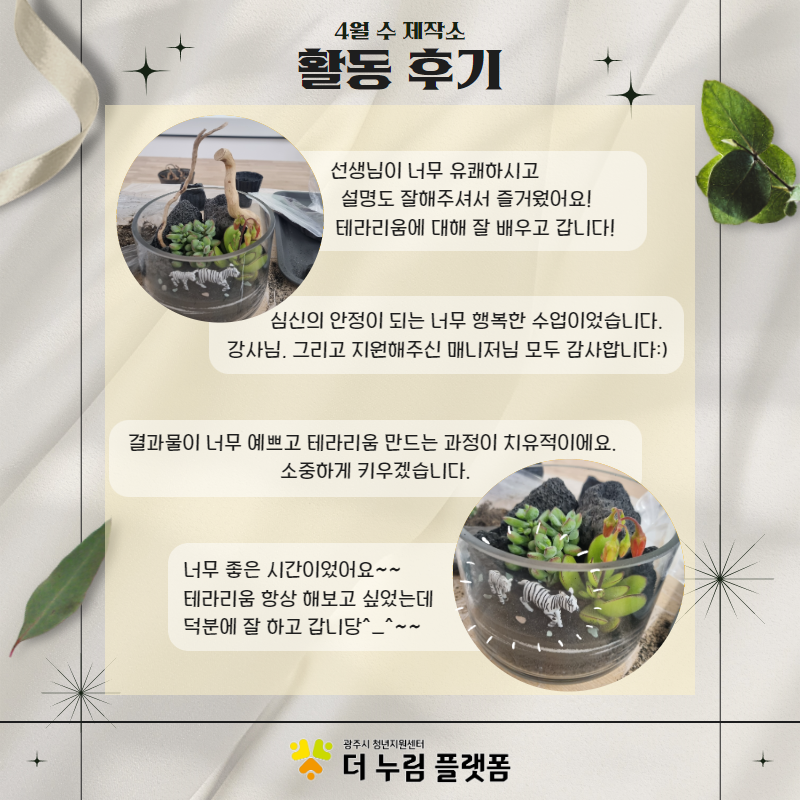 2023년 수 제작소 4월 원데이클래스 프로그램 후기 작성자관리자 등록일 23-04-24 조회1,151회 본문 2023년 수 제작소 원데이클래스4월 프로그램 테라리움 제작 후기지난 4월 6일, 20일 (목),4월 수 제작소 원데이클래스 참여 청년 들이 <나만의 테라리움 정원 제작> 프로그램을 참여하셨습니다.광주시 청년들이 직접 다육식물을 식재하며 나만의 정원을 제작하는 힐링의 시간을 보내셨습니다! 2023년 취업 올라 4월 사회초년생 면접심화 패키지 프로그램 후기 2023년 마인드 휴게소 4월 심리진단 프로그램 후기 목록