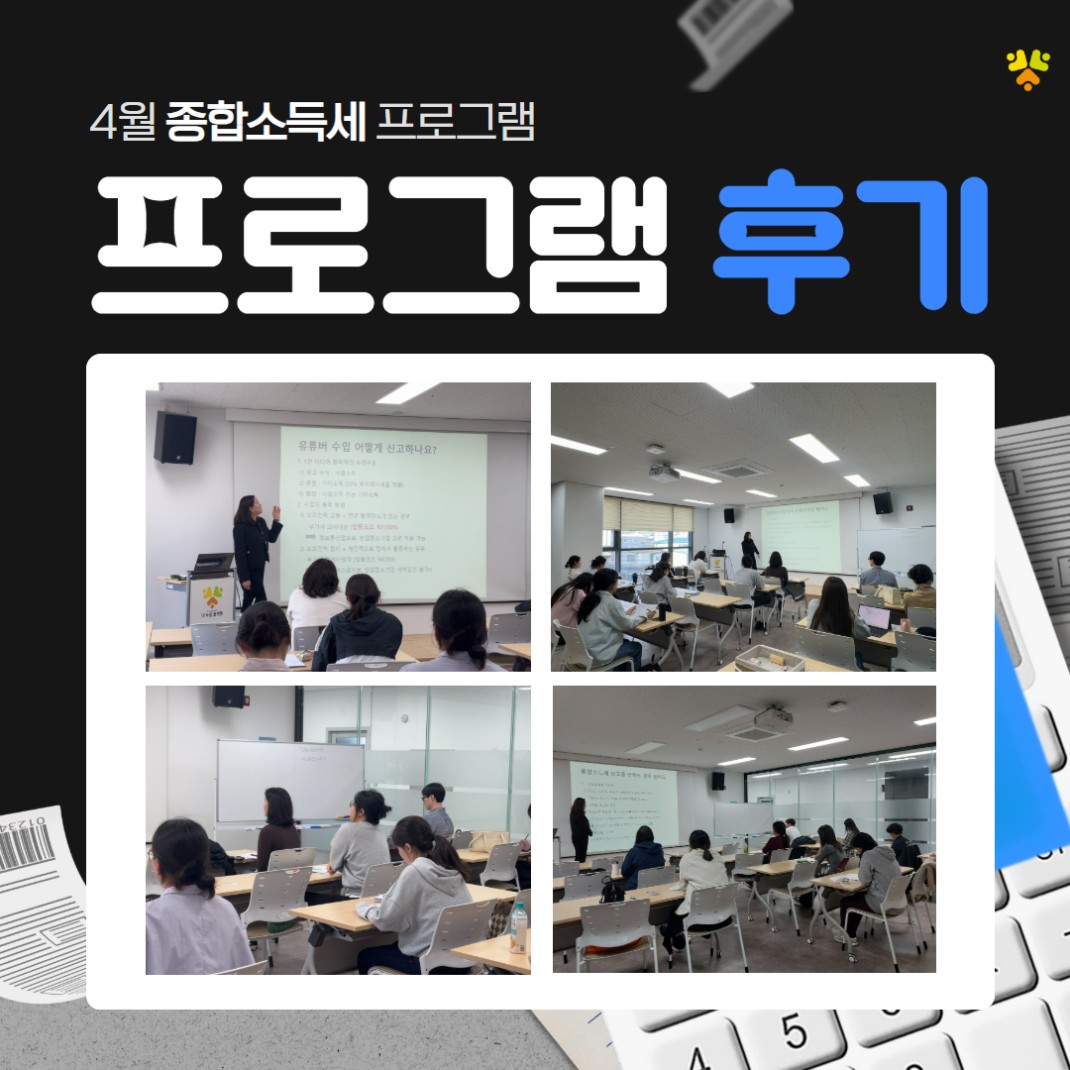 25년 4월 취업직무 종합소득세 프로그램 후기 작성자관리자 등록일 25-04-17 조회388회 본문 안녕하세요. 역량담당 하이매니저입니다!4월 11일 금요일에는 종합소득세 수업이 진행되었습니다✨프리랜서, N잡러 청년에게 꼭 필요했던 종합소득세 신고 방법부터 절세팁까지!너무나 유익했던 시간이었답니다 :)후속 프로그램까지 원할 정도로 청년들의 뜨거운 관심을 받았던종합소득세 프로그램 후기 함께 보실까요?☎070-5015-0624 <글라스아트 후기> 4월 원데이 프로그램 25년 4월 취업직무 AI활용 면접대비 프로그램 후기 목록